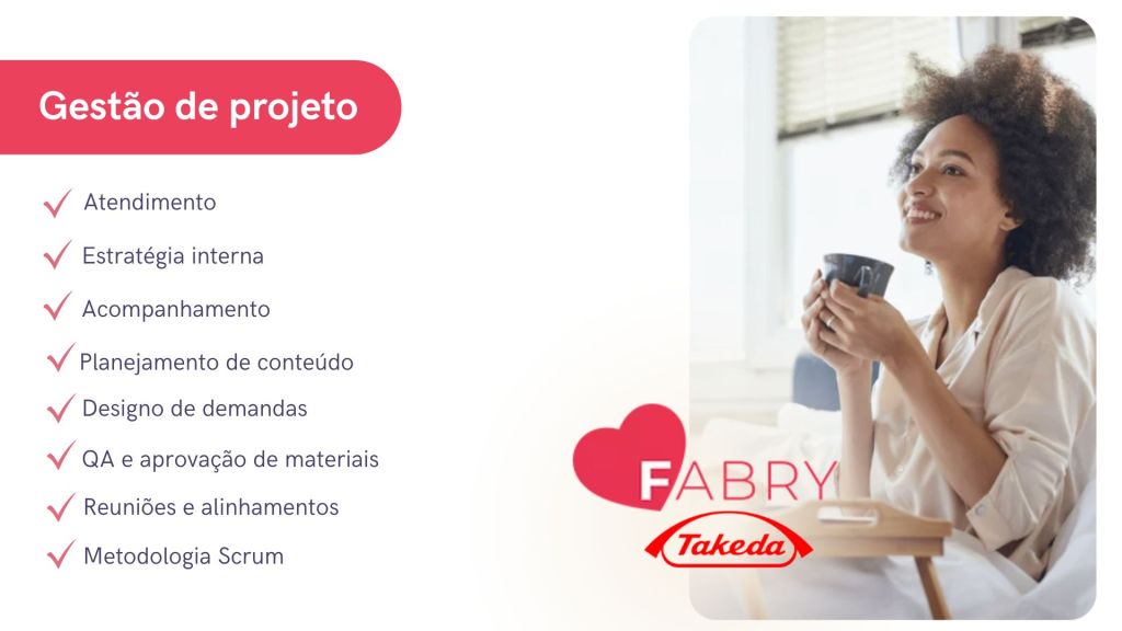 Com o time da Takeda, fui responsável pela dinâmica interna do projeto na agência, acompanhando os prazos, alinhando demandas e organizando as entregas que envolviam o time de desenvolvimento, design e conteúdo. Minha rotina de trabalho acompanhava diferentes ações: