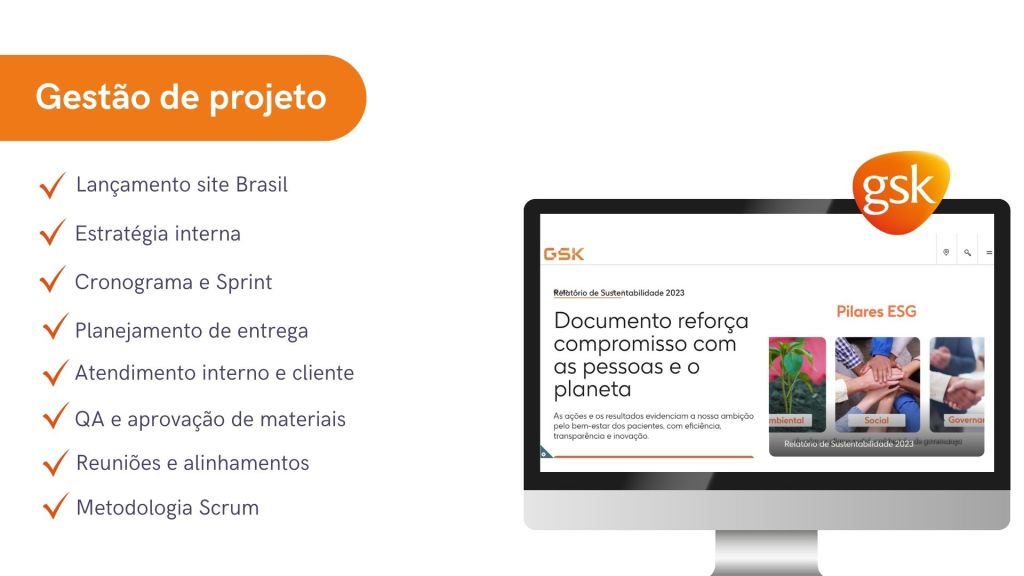 Como Agilista de Comunicação, fui responsável pela organização e acompanhamento do site da GSK Brasil, desenvolvendo o cronograma interno de entrega e o controle de qualidade de entrega para o cliente.