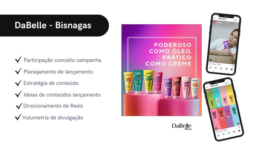 Com a DaBelle Hair desenvolvi um planejamento focado na campanha de apresentação das novas bisnagas. Nosso foco era apresentar os produtos destacando a sua tecnologia óleo em creme.