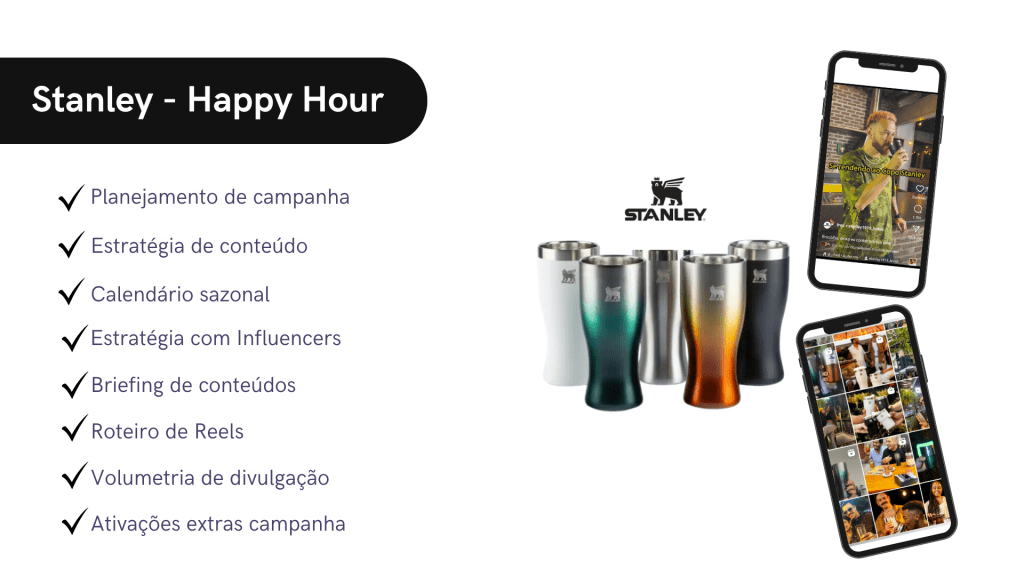 Fui responsável pelo planejamento de lançamento da nova linha da Stanley: a linha Happy Hour. O planejamento explorou o ritual mais sagrado de todo brasileiro, o famoso happy hour, unindo a tradição do país com a inovação da marca Stanley. Apresentamos 5 novos modelos de forma criativa e o resultado foi mega positivo: